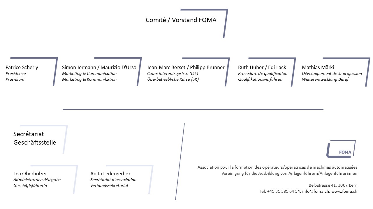 Le Comité se compose de représentants des différentes régions et branches de l’industrie. Les membres du Comité ont la charge, individuellement ou à deux, d’un domaine d’activité. Ils assurent l’accompagnement stratégique du Secrétariat dans leur domaine de compétence. Le Comité est constitué selon l'organigramme ci-dessous.